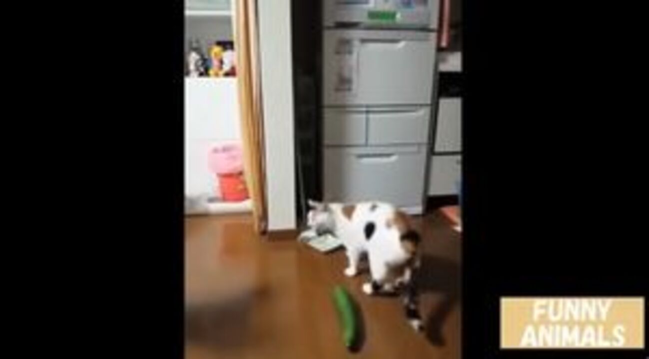 猫がきゅうりを見て飛び上がる動画を